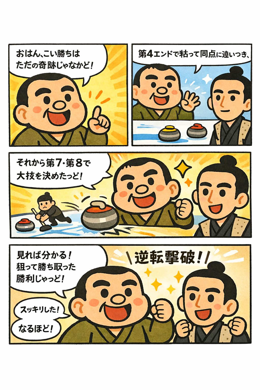 記事では第4エンドで同点に追いついた粘りから、第7と第8で空気を変えた一撃、最終エンドのウイニングショット(最後に勝ちを決める投げ)までを、分かりやすうほどいていくど。相手のミスか実力かでモヤっとしちょる読者のために、技術と判断と胆力の三つ巴で整理するごわす。