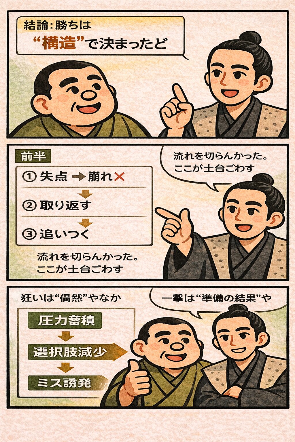 じゃっどん今は、まだ全部を言い切らん。勝ちの芯は一つじゃなか。技術もある、判断もある、胆力もある。どれか一個だけで説明したら、またモヤるっど。まずは前半、地味じゃっどん勝負の土台になった場面から入るでごわす。第1で失点しても崩れず、第2で取り返し、第4で追いついた…あの粘りが、後半の光を呼んだんじゃ。