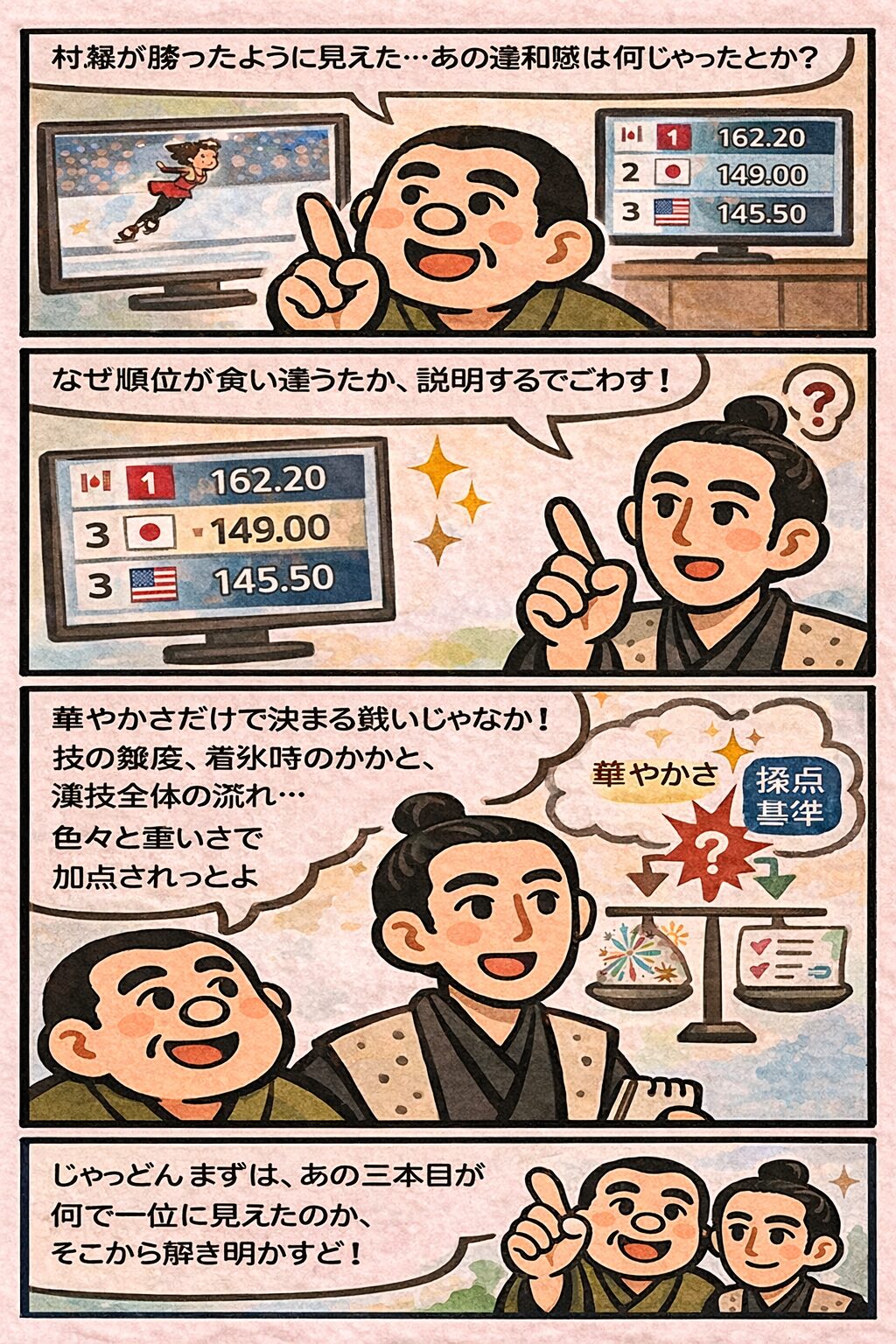 じゃっどん、すぐに答えを言い切るのは野暮というもんじゃ。そこには技の難度だけでは語れん、別の尺度が潜んじょる。まずは、あの三本目がなぜ一位に見えたのか、その感覚から丁寧にほぐしていくとしようかの。