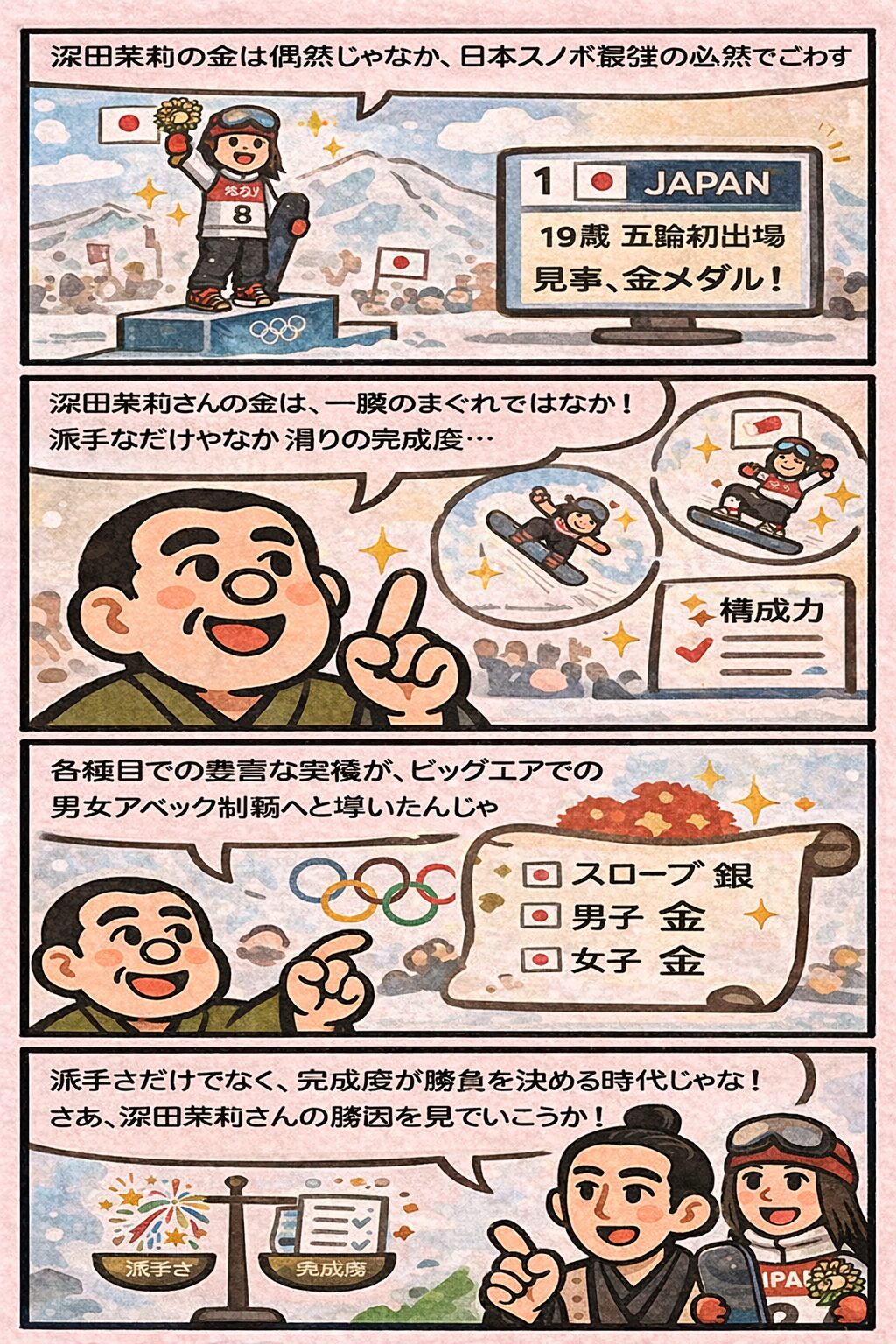 派手さで目を奪い、完成度で勝ち切る。これがいまの日本スノーボードの姿じゃ。長野大会に並ぶ金五つという数字も、その積み重ねの結果でごわすな。