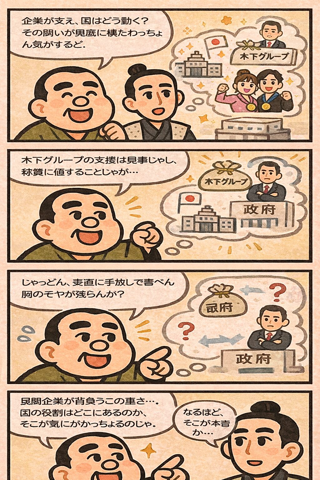 企業が支え、国はどう動くか。この問いは、今回の話の奥底にずしりと横たわっちょる気がしてならんごわす。木下グループの支援は見事じゃし、称賛に値することは疑いようもなか。