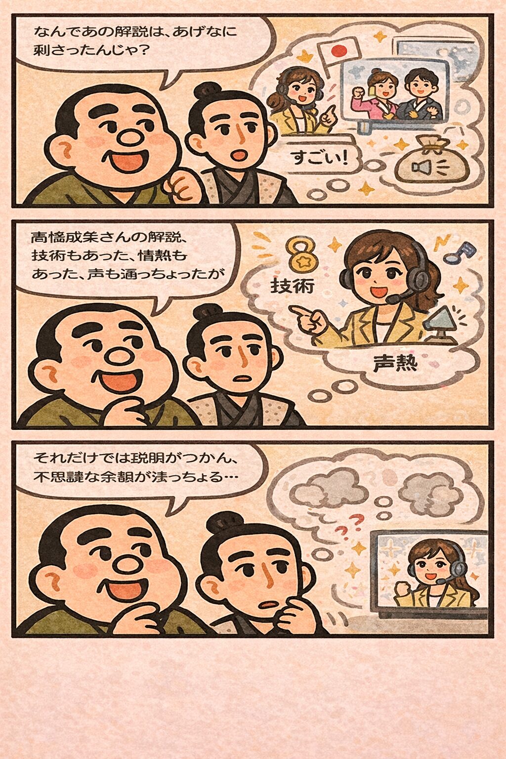 今回の中継で語られちょるもう一つの焦点は、実況アナウンサーの在り方じゃ。通常のスポーツ中継では、技名や状況説明が次々と差し込まれる。情報量が多いことが善とされがちじゃ。