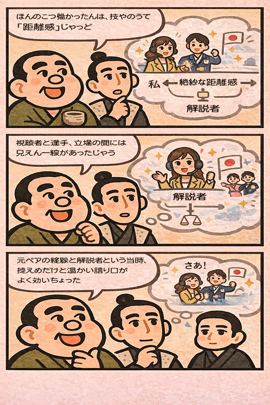 だから視聴者は思うたはずじゃ。ああ、この人は競技を一番に考えちょると。そこに信頼が生まれ、言葉が重みを帯びた。これがこの記事の芯でごわす。